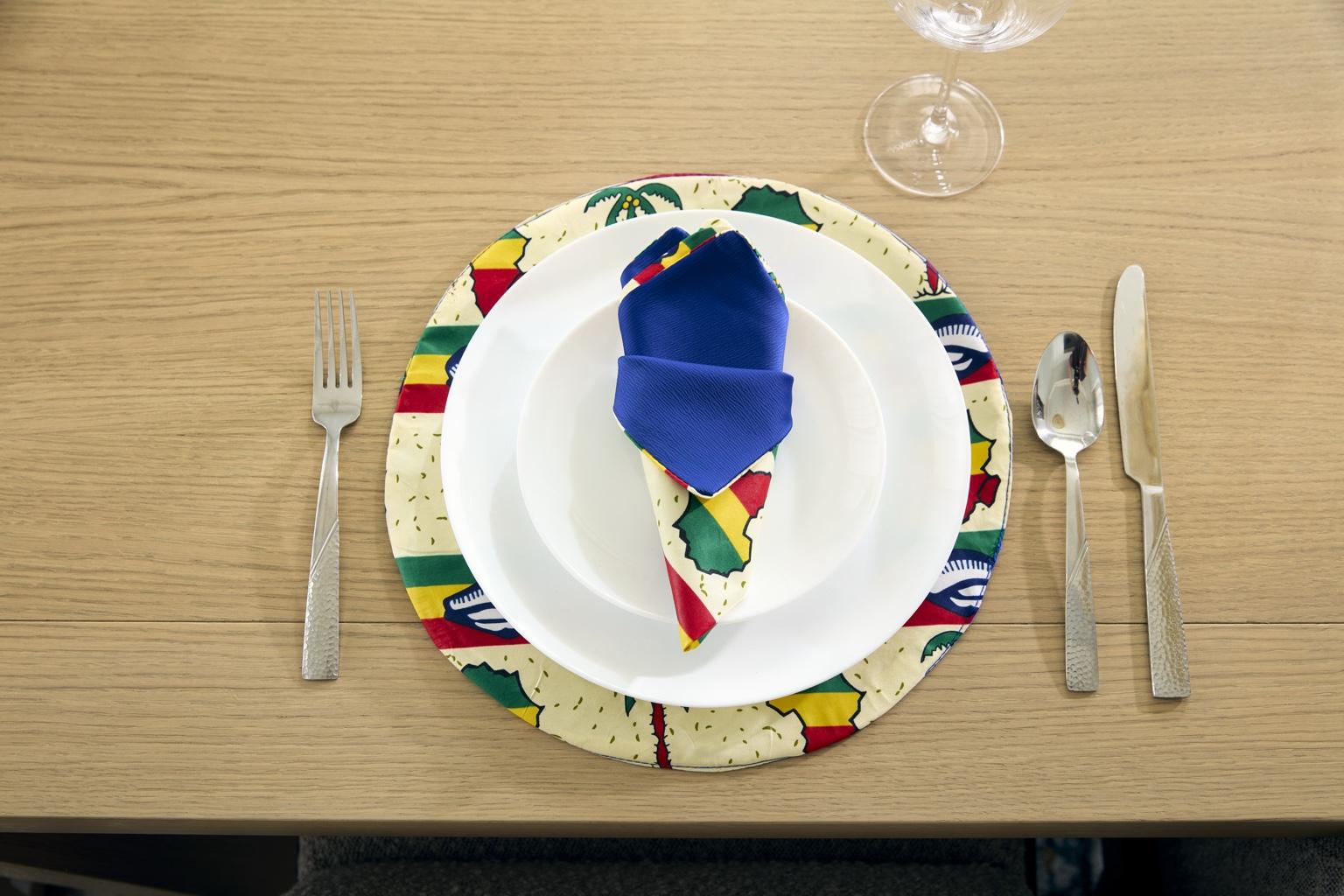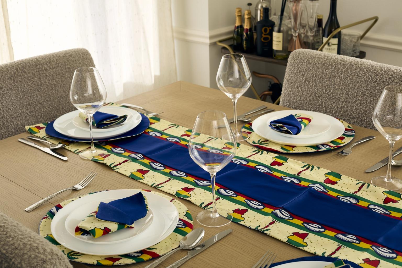 Bring a vibrant celebration of West African spirit to your dining table with the Accra Harvest Blue set. Featuring bold, earthy motifs of Ghanaian maps, cowrie shells, and palm trees, this design is anchored by a rich royal blue center that evokes tradition with a modern edge. Each piece in this set honors the colors of pan-African prideâred, yellow, greenâand captures the joyful rhythm of community gatherings and harvest feasts.
