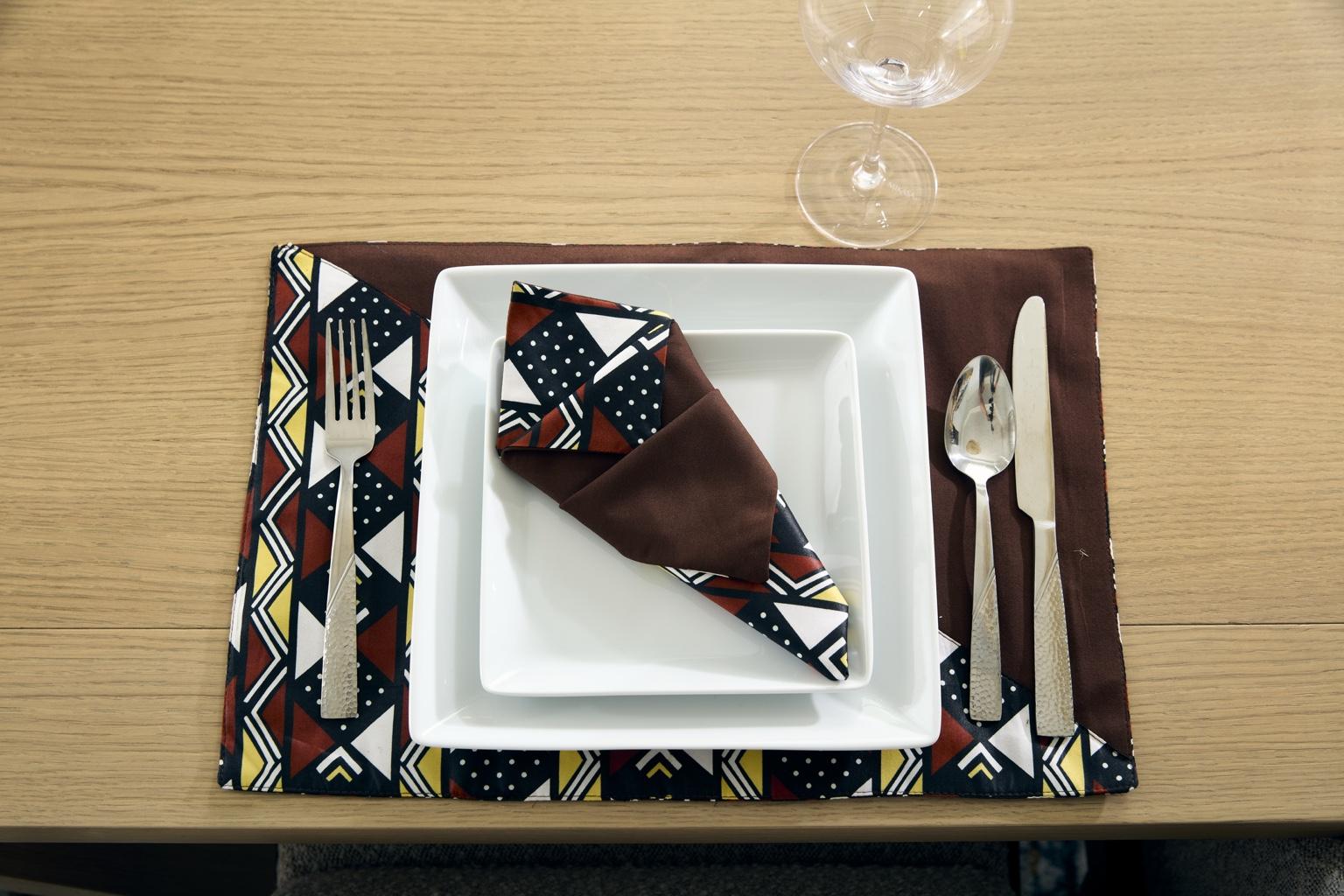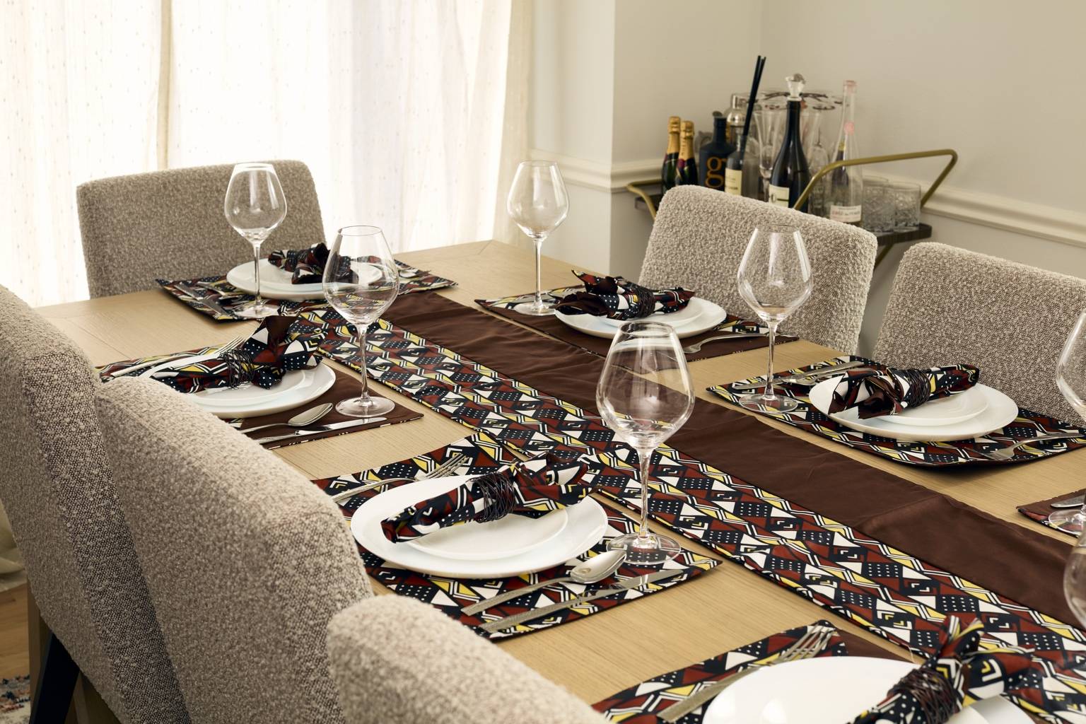 Boma Bronze is a tribute to the warm, grounding tones of the Congolese coast. Anchored by deep chocolate brown and bordered by intricate, geometric tribal motifs, this set channels timeless heritage and modern elegance. Whether you’re setting the table for everyday beauty or hosting a special gathering, this design brings richness, story, and structure to your dining space.