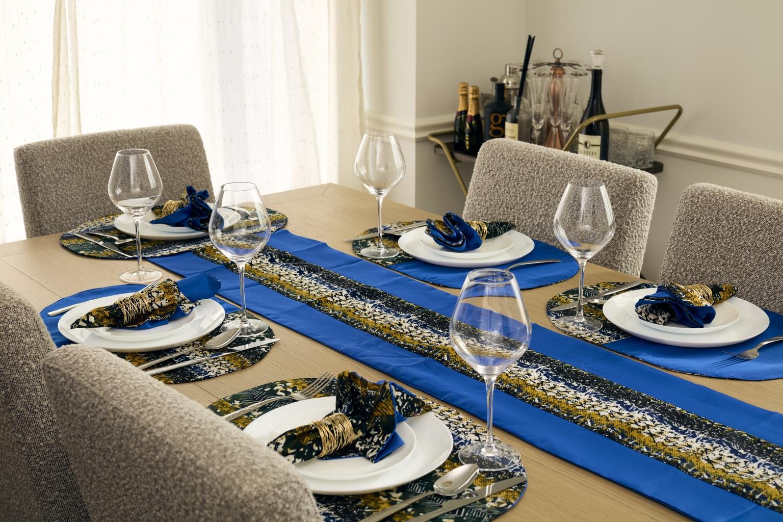 Immerse your space in elegance with Nairobi Royale, a bold statement of deep cobalt, golden tones, and traditional print. This set evokes regal dining experiences, blending rich African heritage with modern sophistication. Perfect for evening gatherings or festive occasions that deserve a hint of majesty.